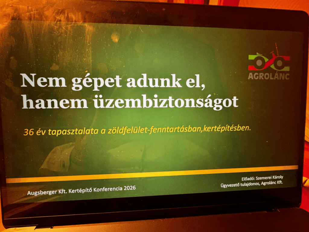 Esztergom, 2026. február 5. – Szemerei Károly, az Agrolánc Kft. ügyvezetője, értékesítési vezetője és a MATE vendégprofesszora „Új gondolatok a kertépítésben” címmel tartott előadást az Augsberger Gyepszőnyeg Kft. hagyományos éves szakmai konferenciáján és partnertalálkozóján. A rendezvényre Esztergomban, a Bellevue Konferencia és Wellness Hotelben került sor, ahol a kertépítés és zöldterület-kezelés vezető szakemberei gyűltek össze.
