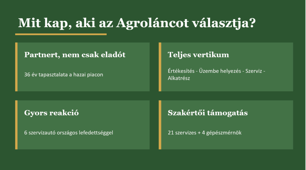 Agrolánc Assistance – Teljes körű szolgáltatási csomag, amely prioritásos szerviz-hozzáférést, kalkulálható költségvetést és maximális üzemidő garanciát jelent. Ahogy ügyvezetőnk fogalmazott: „Helyes gépválasztás + Assistance = ZÉRÓ GOND”.